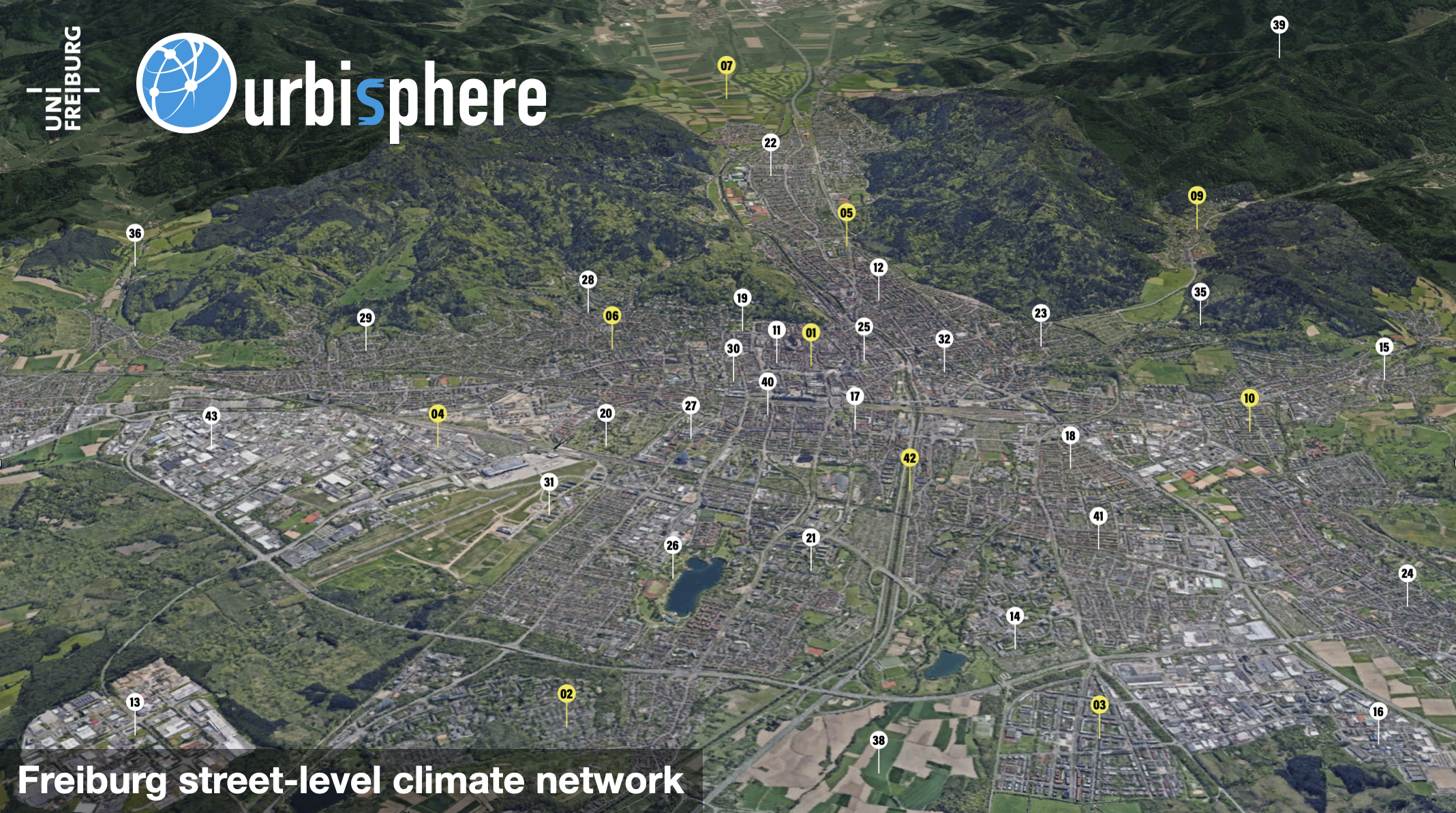 As part of the ERC-funded smart urban observation system, 40 new and small weather stations were installed on street lights across the city of Freiburg. Today, the first built-up phase was completed and recording has begun. The stations help our development and testing of models for thermal comfort and extreme precipitation forecasting at street level in cities. They also inform the public through EU open data.
